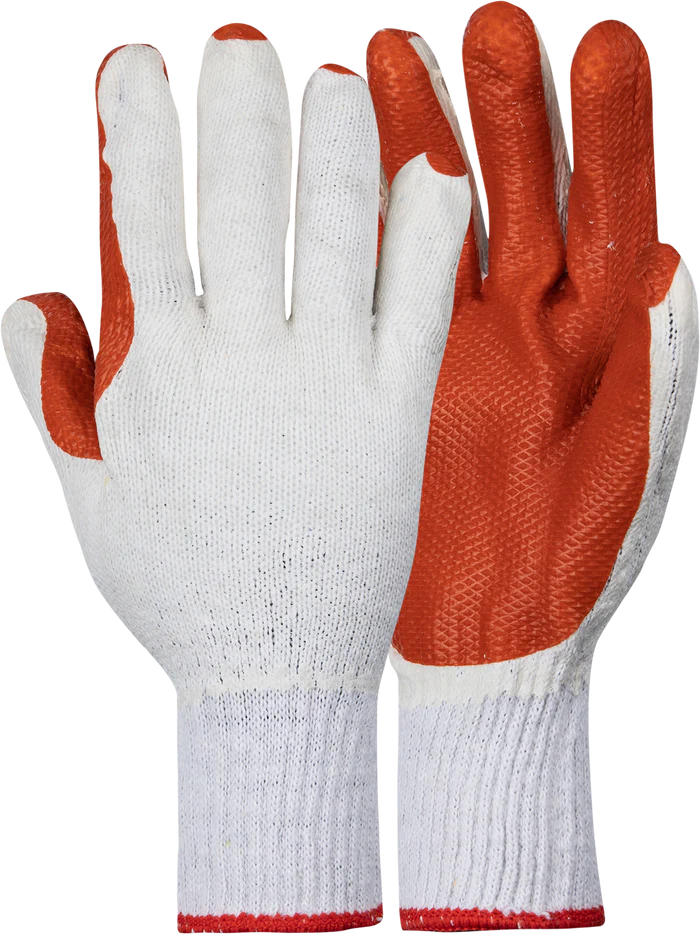 7 Gauge bleached T/C liner, red latex on palm. Rough rubber coated palm for handling slippng or abrasive objects.